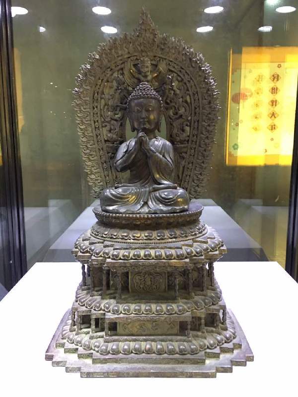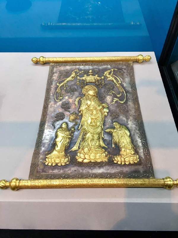 繼上個月舉辦的第一季“民國瓷畫展”,目前正在展覽的是第二季“佛像藝術展”。展出了遼金時期的銀鎏金佛塔、宋代泥塑描金的書卷觀音像、唐代捶揲銀鎏金“佛說金色王經”上下卷,還有南北朝時期的石雕彩漆描金思維菩薩像,這一期展出了29件展品。