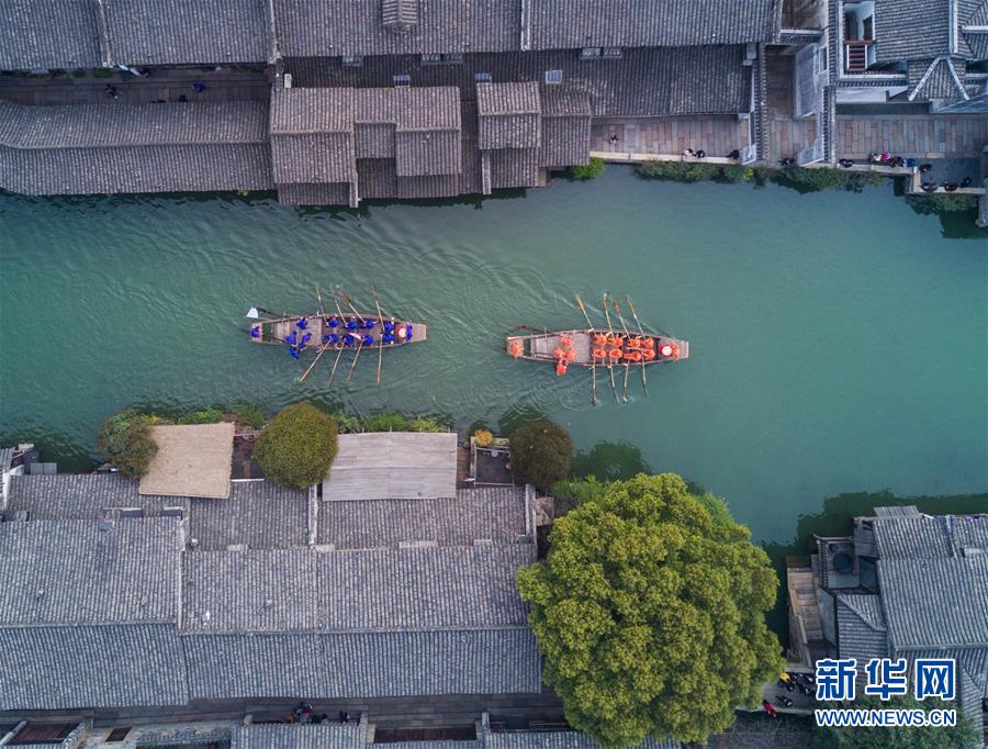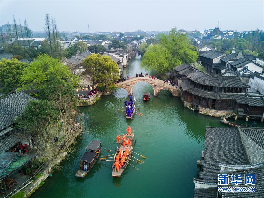 3月29日,烏鎮(zhèn)水鄉(xiāng)百姓在烏鎮(zhèn)西柵景區(qū)參加名為“踏白船”的傳統(tǒng)水上競(jìng)技活動(dòng),吸引游客前來(lái)感受水鄉(xiāng)獨(dú)特的民俗風(fēng)情?!疤ぐ状备?jìng)賽的目的是為了祈求蠶桑豐收。