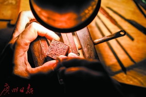 顧名思義,疊字印就是在印章的字上再刻字,下面的字細,上面的字粗?!翱桃粋€疊字印要兩天,如果是比賽的話,一個小時左右就能搞定。”項頌秋說。