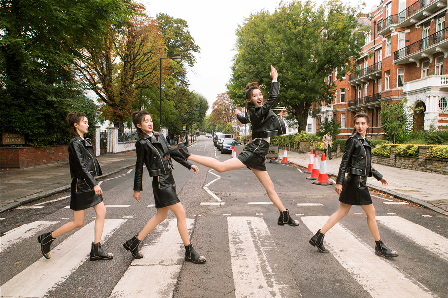 ??? 近日,金晨一組在倫敦的街拍照曝光。照片中,金晨置身于倫敦的艾比路,黑色皮衣搭配短裙大秀美腿,馬丁靴的搭配也更顯前衛(wèi)時(shí)髦。與以往或優(yōu)雅或復(fù)古的街拍不同,金晨此次歡脫地模仿起披頭士過馬路的經(jīng)典畫面,一人cos披頭士四位成員,可謂創(chuàng)意十足。而她時(shí)不時(shí)做出旋轉(zhuǎn)跳躍的高難度的動(dòng)作,令不少網(wǎng)友紛紛表示:為金晨瘋狂打call。