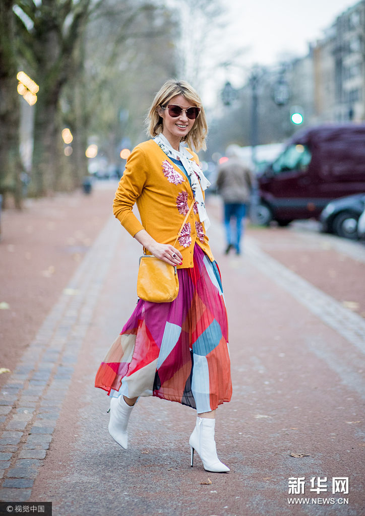 ??? 近日,德國杜塞爾多夫,時(shí)尚博主Gitta Banko街拍。她戴Miu Miu茶色墨鏡,身穿Steffen Schraut橘色亮片拼貼針織開衫,內(nèi)搭Steffen Schraut白色蝴蝶印花系帶雪紡襯衫,Steffen Schraut拼色百褶紗裙,肩背Volker Lang橘色口金包,腳踩Kurt Geiger白色尖頭高跟短靴。
