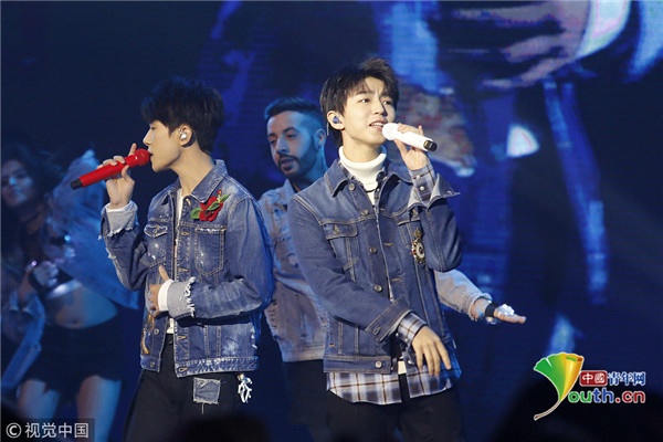 ??? 北京,12月12日晚,王俊凱、易烊千璽現(xiàn)身某活動,兩人身穿牛仔外套獻唱嗨翻全場,又換上紅色衛(wèi)衣舉廣告宣傳標(biāo)語