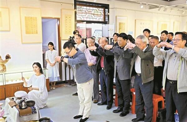 絲竹管弦伴著《詩經(jīng)》吟誦,古雅之風(fēng)貫穿了古今。當(dāng)天除了慕雅思古之外,亦有崇賢。參加活動的眾人,向書圣王羲之的畫像作揖、致敬。羅烈杰、盧紹武、李靜現(xiàn)場做了熱情洋溢的講話,他們鼓勵(lì)書界同仁要團(tuán)結(jié)努力,既要繼承傳統(tǒng)、又要推陳出新,不斷弘揚(yáng)中華民族的優(yōu)秀文化。禮畢后,著名古琴家高建國現(xiàn)場操琴。除此之外,還有精彩的茶藝、二胡表演等等。
