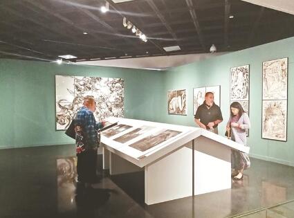 選擇“造藝之書”作為展覽的主題,是以 “技藝與方法”即技與道為一的中國(guó)藝術(shù)精神來回應(yīng)當(dāng)下數(shù)字時(shí)代的挑戰(zhàn)。展覽由中國(guó)文聯(lián)副主席、中國(guó)美協(xié)副主席、中國(guó)美術(shù)學(xué)院院長(zhǎng)許江教授領(lǐng)銜,組成了多畫種、老中青結(jié)合的創(chuàng)作團(tuán)隊(duì)。記者在現(xiàn)場(chǎng)看到,展覽的一大板塊,是版畫系近幾年來“藝術(shù)家書”課程的教學(xué)科研成果。大、中、小三種不同格式的“藝術(shù)家書”,共計(jì)作品100件有余,內(nèi)容豐富,材料、形式語(yǔ)言多樣。尤其值得一提的是,此次展覽還包括了2016年完成的中華文明重大歷史創(chuàng)作工程項(xiàng)目《天工開物》版畫長(zhǎng)卷。