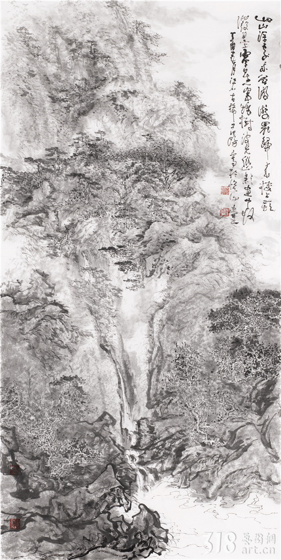 我以為,范陽先生是真正在心性上貼近古人“不下堂筵,坐窮泉壑”,其現(xiàn)居贛中名岳武功山、楊岐山之中。尤其武功山,史上與衡山、廬山并稱江南三大名山,被冠以“衡首廬尾武功中”,山脈綿延浩瀚,茫茫無際。范陽先生終日面山臨壑,弄筆自適,得武功真容。山水畫從來就不是簡單的描摹自然的風光,無論丘園養(yǎng)素還是泉石嘯傲,都是畫者精神的自然流露,這是畫家筆墨情態(tài)的表達,亦是畫家藝術(shù)境界追求的體現(xiàn)。對于山林的描繪,承載了畫者對泉石意趣的向往,對于林下境界的追求。范陽先生的山水畫作品長于布景,對山中的“陰、晴、朝、夕”的細膩描繪都有他自已獨特感悟和表達。筆下極丘壑浩渺之勢,奇峰羅列,宛有風骨,深壑幽谷,其勢超峻;至于松柏掩映,峭壁涌泉,野道幽麓,于野逸之態(tài)甚備。范陽先生數(shù)十年來遍臨南北宗諸家,遠溯元人四家,清初四王,近至黃秋園,上下求索,崇穆有加,最終歸皈真逸正脈。新近年逾七十之作,日漸精熟,蒼腴古厚,更趨融古化古之態(tài),細究其筆下蹤跡:子久?麓臺?秋園?各不相肖,而莫不精備。諦觀其中景象:匡廬?武功?羅霄?渾然而化,不一而足。如此境地當稱“妙解”。