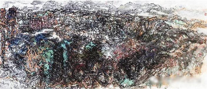 本次畫展題為“妙合化權”,出自宋代黃修復《益州名畫錄》:“大凡畫藝,應物象形,其天機迥高,思與神合,創(chuàng)意立體,妙合化權?!币饧瓷袼寂c物象相協(xié)調,主觀創(chuàng)造與自然物象的妙合無礙,便能筆顯通神,創(chuàng)意無限,這也是中國畫家們追求的至高境界。孫克說,中國畫講究“外師造化,中得心源”?!皫煼ㄗ匀弧笔钱嫾异`感源泉,也促使中國畫藝術源遠流長,無窮無盡。李照東的新作墨彩繽紛,視覺張力恣肆磅礴,而畫面之中,溪谷幽深,流水潺湲,屋宇聚散,情趣盎然,足見畫家深得“造境”之妙。