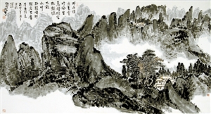 王和平不僅能書(shū)寫2尺的大字,還能寫篆書(shū)、隸書(shū)、行書(shū)、草書(shū)、楷書(shū),他尤其擅長(zhǎng)以指書(shū)寫長(zhǎng)線條幅,還能書(shū)寫小到1寸左右的楷書(shū)、行書(shū)、草書(shū)等各種書(shū)體?!皬乃摹饵S山系列》,我看到了一個(gè)堅(jiān)強(qiáng)的古典腳步,追尋在范寬的《谿山行旅途》中,沐李唐的《萬(wàn)壑松風(fēng)圖》,聽(tīng)馬遠(yuǎn)的《踏歌圖》……一個(gè)精美絕倫的藝術(shù)時(shí)代遠(yuǎn)逝而去,念天地之悠悠,獨(dú)愴然而涕下。留幽幽懷古者,追憶圣賢高士清歌古琴于卷軸中的絕美風(fēng)騷。王和平和我都是這個(gè)幽幽懷古者,追求高貴古典精神的尋賢之人?!边@是評(píng)論家豐川在他的《心有千像,十指墨弦》一文中評(píng)價(jià)王和平的指書(shū)所述。