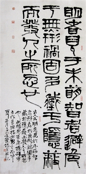 王和平以手指蘸墨,以手為筆,或疾或緩,不到十分鐘,一幅恰似石鑿雕刻力透紙背的書(shū)法作品躍然紙上,其變幻莫測(cè)的創(chuàng)作手法和獨(dú)特風(fēng)格令人叫絕。顯然,用手指畫的難度比用筆畫大得多。一般書(shū)寫一個(gè)字需要用手指蘸墨幾次以上,但又必須使字形整體合理自然,筆畫形式流暢靈動(dòng),不至于顯露手工痕跡,不至于給人以呆滯和工藝性強(qiáng)的感覺(jué)。要恰到好處地體現(xiàn)筆畫的緊湊、粗細(xì)、虛實(shí)、枯榮,是一件很不容易的事。功夫全在指頭,既非一日之功,也非人人可以練就。