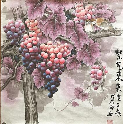 仔細(xì)觀察他筆下的葡萄,那密密實(shí)實(shí)、郁郁蔥蔥的葉子下,葡萄掛滿了架。有的紫紅色,有的青綠色,像瑪瑙,晶瑩剔透的葡萄讓人饞涎欲滴,期間引來雀鳥駐足枝頭,享受著秋收的喜悅和精彩。賀天飛坦言,葡萄題材的創(chuàng)作并非一件易事。在四十多年中,他只畫了九十多幅葡萄圖。一幅斗方的葡萄他通常都要畫上五天到一周。此次展出的作品匯聚了五年來他對這一題材的創(chuàng)作成果。