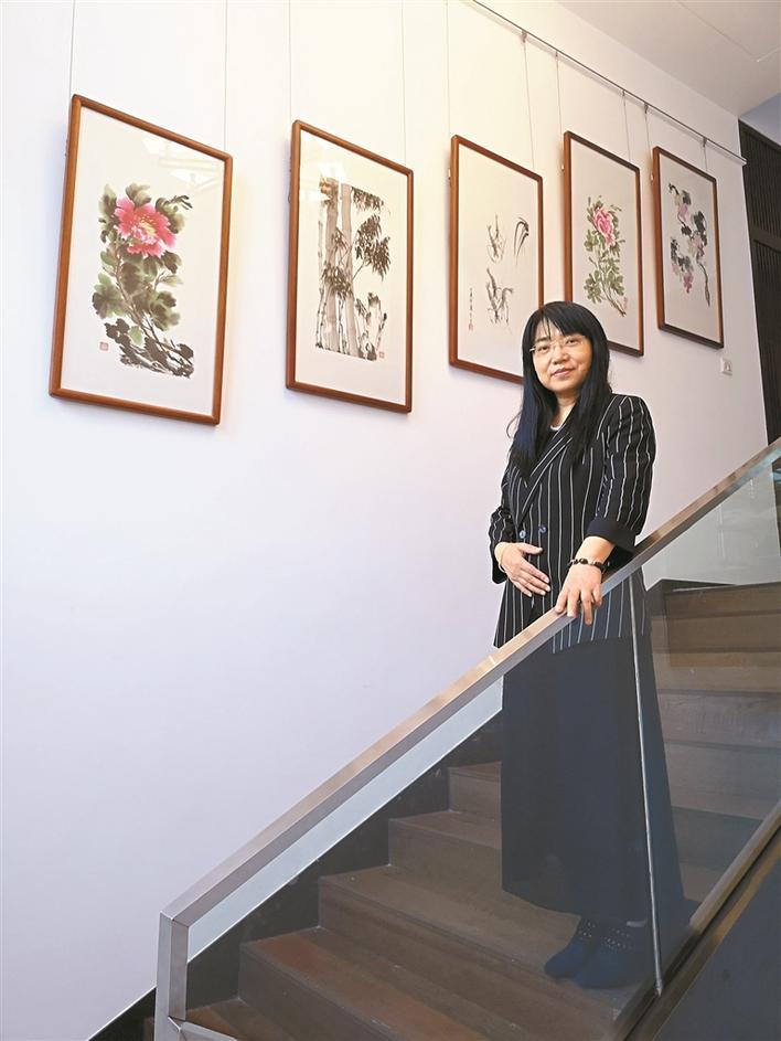 女建造師周桂云和她的國畫作品。
