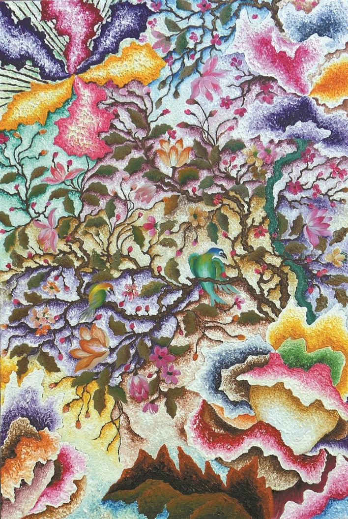 色彩是鄭澤生作品的一大亮點(diǎn)。這源自他第一份工作是在深圳增邦印花廠(chǎng)學(xué)調(diào)色,長(zhǎng)期的訓(xùn)練和刻苦的努力練就了他對(duì)色彩的敏感度?!断诺南愀窭锢愤@組作品可以說(shuō)是他近期創(chuàng)作中布局最為精細(xì)、顏色最為豐富的代表作之一。畫(huà)面布滿(mǎn)圖騰式的形象,萬(wàn)物共生。此時(shí)鄭澤生處理群像時(shí)顯現(xiàn)出一派欣欣向榮的景象,每一寸都散發(fā)著生命的光輝和絢爛。