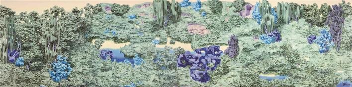 扈海風的繪畫,呈現(xiàn)出一種介于中國水墨與西方架上藝術之間的視覺效果,具有中國水墨的時空韻腳。扈海風用近乎絲網印刷的平涂手法,對幾個具有中國元素的形象符號展開審視。那些原本存在于古典語境中的符號經歷復制、重疊等過程而被重塑,還原成山水或風景,成為藝術家筆下的“中國花園”。