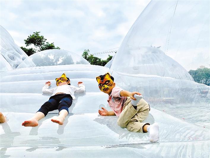 在本屆鳳凰花嘉年華主會場——華僑城體育文化中心綠地空曠自然的草坪上,由本土新銳建筑設計師黃澤林設計和創(chuàng)作的巨型充氣建筑“空氣山”拔地而起。人們可以自由地在“空氣山”的多維表面上嘗試坐、臥、立、躺的體驗。而張凱琴、張齊努、劉小青三位國內(nèi)知名自然藝術家即興創(chuàng)作的“歇腳云”等自然裝置,通過空間藝術作品與公眾的互動,喚醒著人們對自然的熱愛。