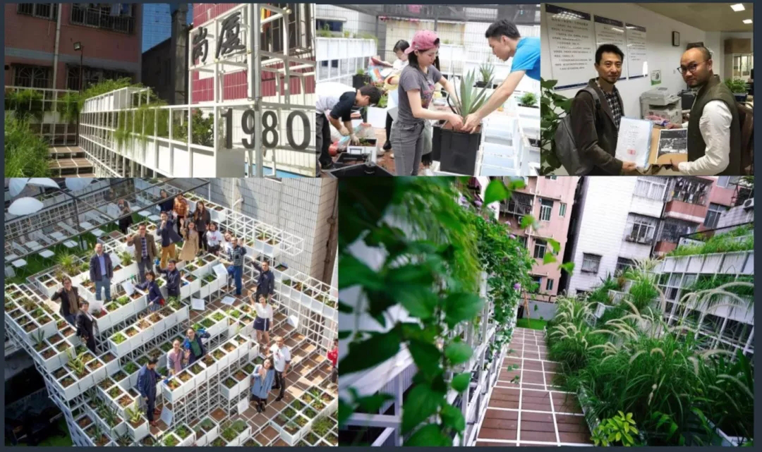 來自本地智慧的聯(lián)合創(chuàng)始人謝克非先生介紹說,作為城中村改造的實(shí)踐者,我們在做就是如何在這些矛盾中獲得共生。或者說,如何把所有矛盾點(diǎn)結(jié)合起來,讓城中村可以可持續(xù)地發(fā)展。所以在2018年3月聯(lián)合大自然保護(hù)協(xié)會(TNC)、桃花源生態(tài)保護(hù)基金會、深圳市城市規(guī)劃設(shè)計(jì)研究院、聯(lián)合公設(shè)發(fā)布了綠色天臺:愚公計(jì)劃2.0——崗廈1980海綿城市綠色屋頂示范項(xiàng)目。這個(gè)綠植天臺不僅是能夠美化環(huán)境,截存雨水、循環(huán)灌溉綠植等,更重要的是我們希望它作為一個(gè)平臺,把NGO的理念注入城中村,讓大家把對城中村的注意力從貧富懸殊、拆遷轉(zhuǎn)移到綠色環(huán)保,促進(jìn)可持續(xù)的發(fā)展。這里不僅是個(gè)景觀的平臺,更是內(nèi)容發(fā)動(dòng)機(jī),能夠持續(xù)地產(chǎn)生更多的內(nèi)容。通過藝術(shù)、教育、公益等不同板塊的活動(dòng),以內(nèi)容的方式,把文化、環(huán)保、可持續(xù)發(fā)展等的信號不斷在這個(gè)點(diǎn)上發(fā)散出去,讓大家重新認(rèn)識城中村,從持續(xù)性的內(nèi)容信息實(shí)現(xiàn)社區(qū)營造,服務(wù)不同階層的人,讓更多人覺得環(huán)保、教育這件事情其實(shí)是非常有趣的,不生硬的,大家會主動(dòng)繼續(xù)攜手服務(wù)社區(qū)。