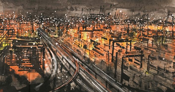 楊曉洋創(chuàng)作的《東方巨港——璀璨鹽田》是此次入選的國(guó)畫(huà)作品之一。作品以深圳港夜色為主題,體現(xiàn)了中國(guó)改革開(kāi)放前沿城市深圳滄海桑田的巨變和這座城市的繁榮景象。同樣是表現(xiàn)現(xiàn)代題材的城市景觀,從楊曉洋的作品中就可看出以對(duì)版畫(huà)的黑白對(duì)比手法、平面構(gòu)成的象征形式、夜景特色的表現(xiàn)手法的出色運(yùn)用等方式來(lái)表達(dá)出作者對(duì)都市景觀的趣味。