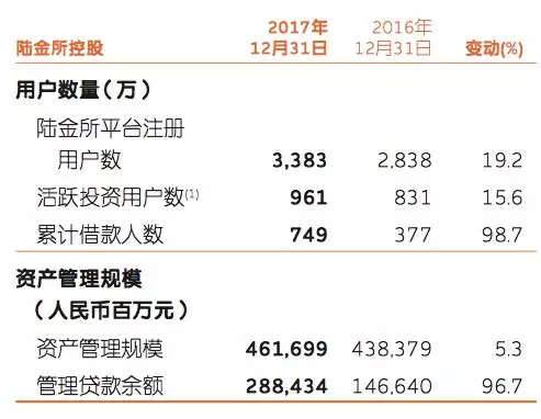 平安年報(bào)顯示,2017年,在財(cái)富管理、消費(fèi)金融、機(jī)構(gòu)間交易等重要業(yè)務(wù)領(lǐng)域,陸金所控股繼續(xù)保持快速發(fā)展,截至2017年末,資產(chǎn)管理規(guī)模達(dá)4,616.99億元,較年初增長(zhǎng)5.3%;管理貸款余額2,884.34億元,較年初增長(zhǎng)96.7%;首次實(shí)現(xiàn)全年整體盈利。