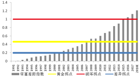 研究發(fā)現(xiàn),貧富差距指數(shù)與經(jīng)濟發(fā)展存在這三個拐點:差異拐點(0.2)、黃金拐點(0.463)及破壞拐點(1)。當貧富差距指數(shù)在0.2以下的低值區(qū)時,絕對平均造成動力不足。當貧富差距指數(shù)高于0.2時,差異的動力效應開始顯現(xiàn),貧富差距指數(shù)與GDP增長率存在顯著的倒U型的非線性關系。而且拐點在貧富差距指數(shù)等于0.463左右,對應的時間為2006-2007年之間,貧富差距在這個水平左右對經(jīng)濟增長的動力效應最高。當貧富差距指數(shù)低于1時,貧富差距處于合理狀態(tài),合理的貧富差距提高了居民的工作動能,有利于促進經(jīng)濟增長,但超過臨界值1,隨著貧富差距進一步提高,貧窮人口會有日益強烈的被剝削感,在一定程度上抑制了經(jīng)濟總量的提升。據(jù)此,近年來我國貧富差距的演變過程可以分為四大階段,分別是“財富絕對平均階段”(1991-2001年)、“差異帶來動力,逐步接近黃金拐點階段”(2001-2007年)、“貧富差異擴大階段”(2007-2015年)及“貧富分化相對嚴重階段”(2015年至今)。經(jīng)研究團隊測算,2018年貧富差距指數(shù)預計已超過破壞拐點。