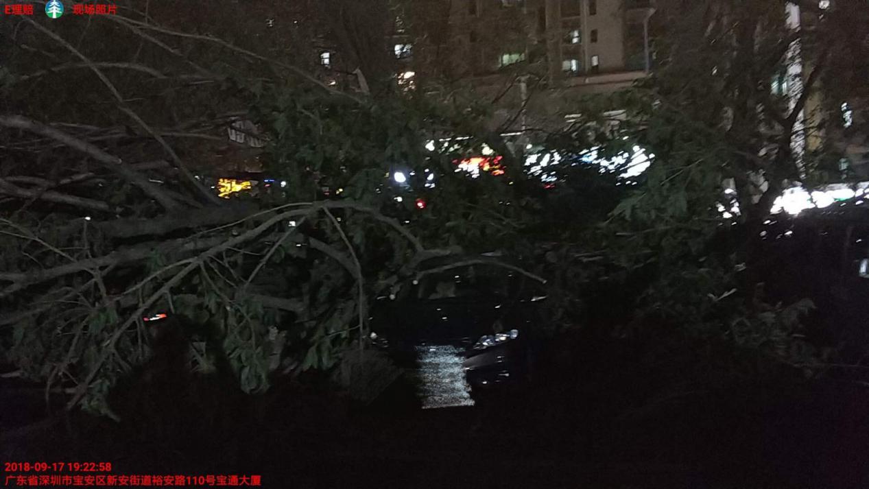 坐標(biāo)寶安,17日晚,95589接到客戶報案車輛被大樹壓砸,接到報案后查勘員3分鐘內(nèi)聯(lián)系客戶,指引理賠手續(xù)。15分鐘內(nèi)到達(dá)現(xiàn)場。指引客戶到太平財險合作車行進(jìn)行維修。