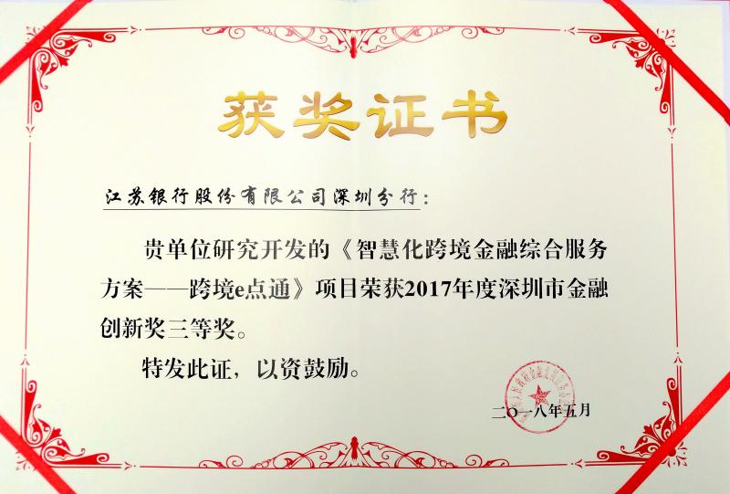 深圳新聞網(wǎng)訊 日前,深圳市政府2017年度金融創(chuàng)新獎評選結(jié)果揭曉,江蘇銀行深圳分行“智慧化跨境金融綜合服務(wù)方案—跨境e點(diǎn)通”項目斬獲三等獎,這是該行連續(xù)四年獲得金融創(chuàng)新獎后再次獲此殊榮,該行也由此成為深圳地區(qū)唯一一家五次榮獲金融創(chuàng)新獎的城商行。