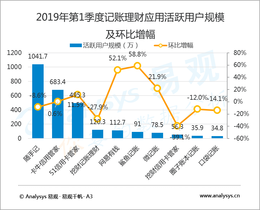 5月24日,知名互聯(lián)網(wǎng)數(shù)據(jù)研究機構(gòu)易觀 Analysys發(fā)布了2019年第1季度記賬理財行業(yè)報告,數(shù)據(jù)顯示,2019年第1季度,在國內(nèi)記賬類應用中,隨手記以1041.7萬活躍用戶規(guī)模蟬聯(lián)榜首,卡牛信用管家和51信用卡管家分別以683.4萬和495.3萬活躍用戶規(guī)模居行業(yè)二、三位。