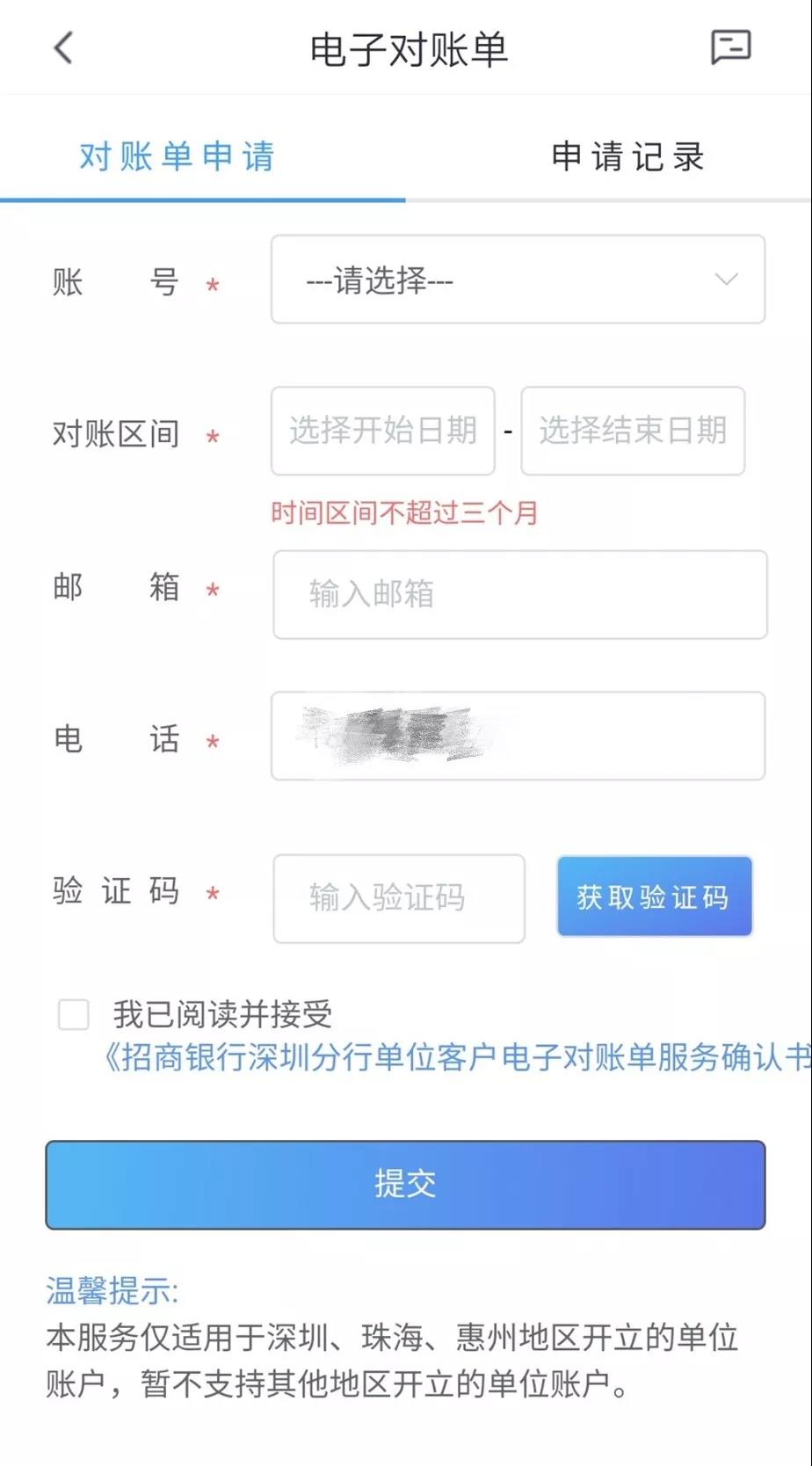 點(diǎn)擊電子對賬單,填寫對賬單申請,輸入查詢賬號和日期、接收郵箱,獲取短信驗(yàn)證碼,點(diǎn)擊提交。