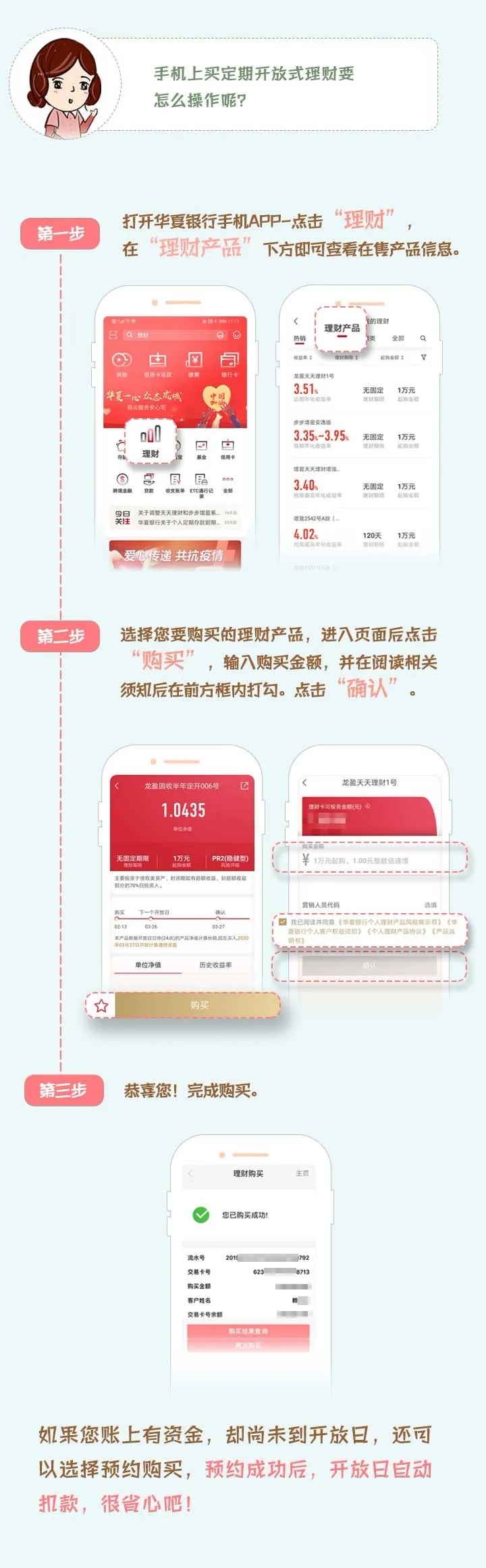 B:盡管足不出戶,您依然能享受著華夏銀行便捷安全的線上服務,開展投資理財業(yè)務,辦理理財產(chǎn)品、信托產(chǎn)品、代銷證券類產(chǎn)品的認申購、贖回等。