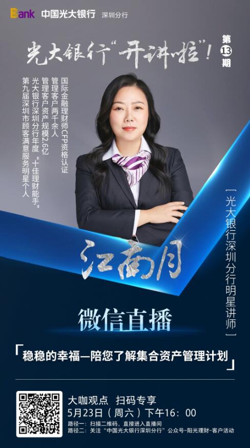 深圳新聞網2020年5月21日訊近日,光大銀行深圳分行將攜手《深圳晚報》于5月23日下午在線開展第十三期《光大銀行“開講啦”!》公益課堂。據(jù)了解,《光大銀行“開講啦”!》是光大銀行深圳分行為客戶推出的每周線上固定公益類講座,內容涵蓋投資理財、市場分析、養(yǎng)生、文化、藝術、讀書、教育、旅游、財稅等。目前已邀前故宮博物院院長單霽翔、江蘇衛(wèi)視《最強大腦》中國隊隊長李威、前華爾街投行金融專家劉湘玲、匯安基金董事總經理魏嵬等外部專家,聯(lián)合多位銀行內部明星講師,一起為客戶帶來精彩課程。