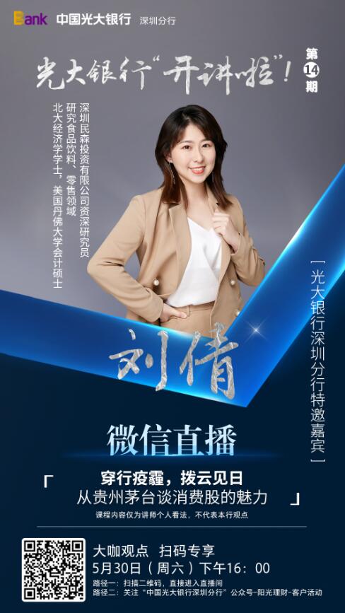 此次,光大銀行深圳分行攜手鳳凰深圳財經(jīng),邀請到北大經(jīng)濟學(xué)碩士、美國丹佛大學(xué)會計碩士、深圳民森投資有限公司資深研究員劉倩女士,在線為客戶帶來《穿行疫霾,拔云見日——從貴州茅臺看消費股的魅力》主題分享。據(jù)悉,劉倩女士關(guān)注于食品飲料、零售領(lǐng)域的投資研究。此次分享,她以眾所熟知的茅臺酒為案例,結(jié)合A股2000年至2018年漲幅數(shù)據(jù)、茅臺歷史、品牌發(fā)展、銷售渠道、市場占有等多方面,介紹孕育牛股搖籃的消費股投資邏輯,幫助更多客戶在全球受疫情沖擊、經(jīng)濟不確定時期,了解A股牛股市場邏輯、知曉投資策略提升個人資產(chǎn)。
