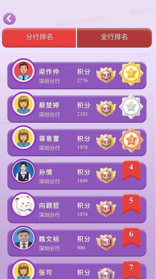 比賽由系統(tǒng)從題庫隨機(jī)抽取5道題目,并匹配在線員工進(jìn)行一對一挑戰(zhàn),考驗員工的知識掌握情況和答題準(zhǔn)確度。根據(jù)積分情況,設(shè)置全行學(xué)習(xí)積分榜,鼓勵員工對標(biāo)學(xué)習(xí)情況,提升“知識段位”。