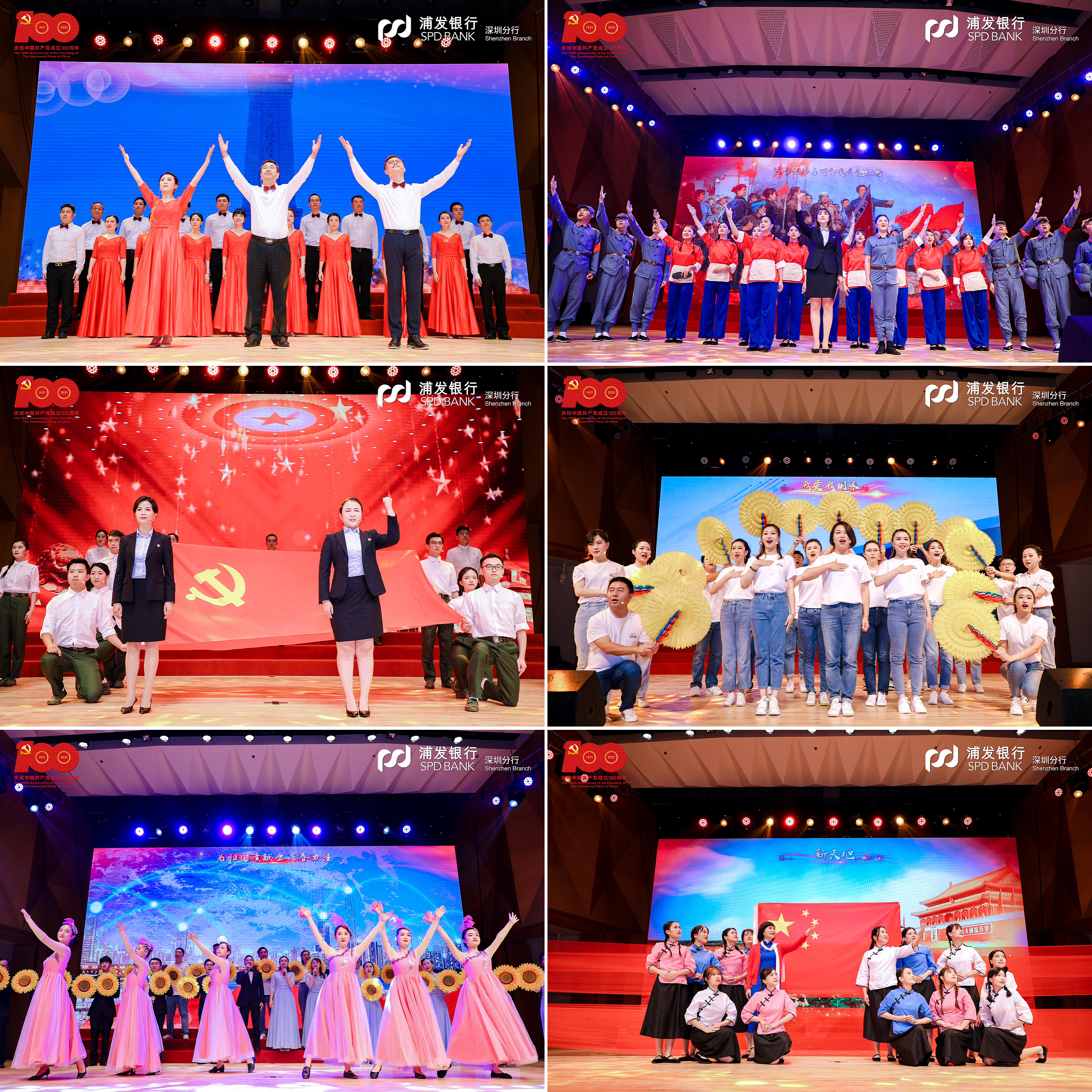 在黨支部風(fēng)采展示環(huán)節(jié),該行基層黨支部精心編排12首紅色經(jīng)典,通過4個篇章再現(xiàn)百年波瀾壯闊的偉大歷程。第一篇章“開天辟地”演繹了中國共產(chǎn)黨在新民民主義革命時期完成救國大業(yè)的輝煌歷程,《保衛(wèi)黃河》吹響了高亢嘹亮的愛國號角,《十送紅軍》深情演繹血濃于水軍民情,《繡紅旗》一腔熱血帶著大家重回歌樂山。第二篇章“改天換地”回顧了中國共產(chǎn)黨在社會主義革命和建設(shè)時期完成興國大業(yè)的奮斗史詩,《歌唱祖國》撥動人們最難忘的記憶,《我們走在大路上》展現(xiàn)當(dāng)年敢闖敢拼的奮進(jìn)之姿態(tài),《唱支山歌給黨聽》唱出人民心中永恒的贊歌。第三篇章“翻天覆地”再現(xiàn)了中國共產(chǎn)黨在改革開放和社會主義現(xiàn)代化建設(shè)新時期推進(jìn)富國大業(yè)的光榮壯舉,《在燦爛陽光下》重現(xiàn)春風(fēng)化雨之后的奮斗時光,《國家》打動多少人的赤子之心,《我們的生活充滿陽光》訴說了改革開放背后的喜悅。第四篇章“驚天動地”展現(xiàn)了中國共產(chǎn)黨在中國特色社會主義新時代推進(jìn)并將在本世紀(jì)中葉實現(xiàn)強(qiáng)國大業(yè)的偉大時代,一首《天耀中華》是浦發(fā)人最深沉的表達(dá),《燈火里的中國》讓人漫步燈火漫卷的萬里山河,《再一次出發(fā)》展示浦發(fā)追夢者的雄姿英發(fā)。走過“百年風(fēng)雨”,浦發(fā)銀行深圳分行合唱團(tuán)一首《我和我的祖國》,蓬勃朝氣盡顯拳拳愛國心、濃濃赤子情。篇章結(jié)束,大家全體起立,高聲合唱《沒有共產(chǎn)黨就沒有新中國》,以最真摯最熱烈的歌聲獻(xiàn)禮建黨百年。