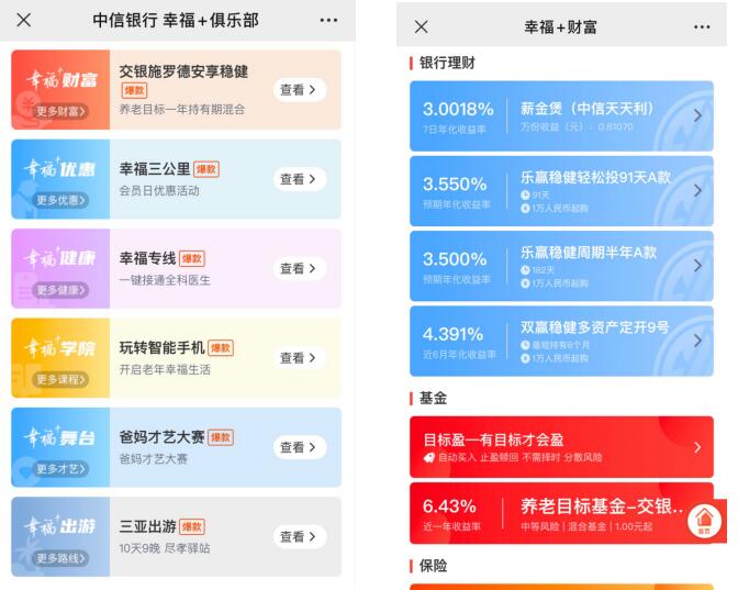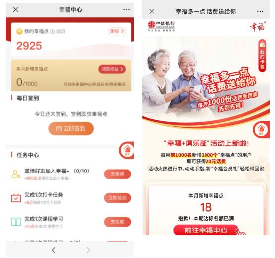 中信銀行“幸福+俱樂部”“幸福+財(cái)富”頁(yè)面展示
