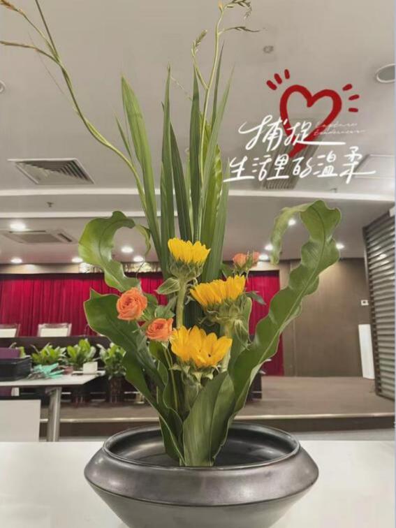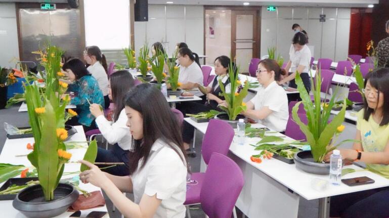 活動現(xiàn)場,馮老師詳細(xì)介紹了傳統(tǒng)花藝的歷史文化、插花造型、色彩搭配、器具應(yīng)用等基礎(chǔ)知識,從花語寓意、花材修剪、構(gòu)圖等方面深入淺出的講解插花的要點(diǎn)。在悠然的花香浸染間,輕柔的音樂熏陶中,大家按照馮老師展示的步驟,將花朵、樹葉精心剪裁、混搭、點(diǎn)綴成束,將一朵一朵鮮花、綠葉錯落有致地插在花盆中里,普通的花葉、枝條,經(jīng)過大家精巧的修飾與加工之后,變成了令人賞心悅目的藝術(shù)品。整個(gè)會場花香四溢,歡聲笑語,充滿了輕松歡快的氛圍。
