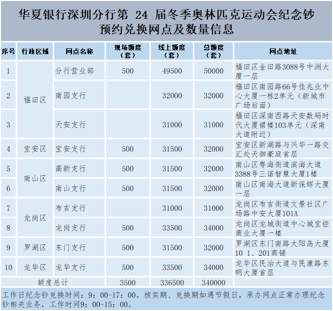 華夏銀行深圳分行共10家網點承辦冬奧紀念鈔發(fā)行工作。為方便老年客戶預約紀念鈔,該行7家網點開放線下預約,市民可持有效的第二代居民身份證原件至公告的現場預約網點辦理預約。紀念鈔先到先得,額滿為止。