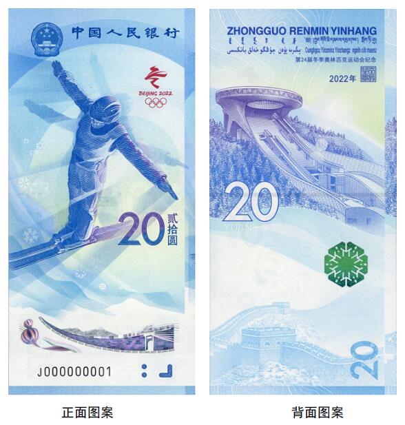 正面圖案:正面主景為自由式滑雪運動員圖案,上方為中華人民共和國國徽、“中國人民銀行”行名,右側為第24屆冬季奧林匹克運動會會徽、面額數字“20”與漢字“貳拾圓”,下方為動感全息圖案、盲文面額標記和冠字號碼。