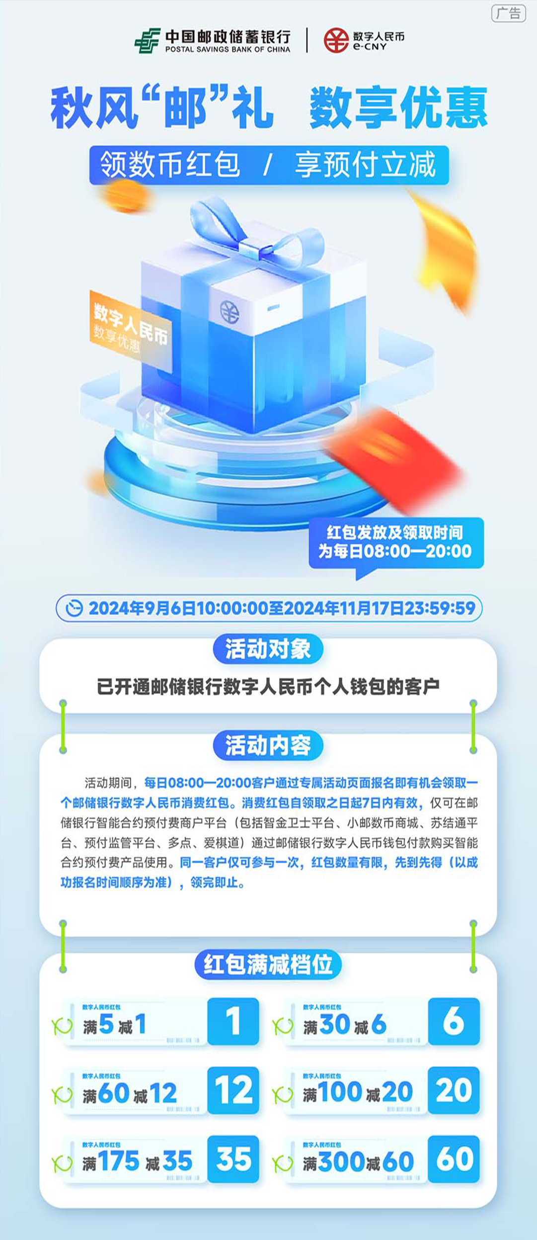 2024年9月6日10:00至2024年11月17日23:59,已開(kāi)通郵儲(chǔ)銀行數(shù)字人民幣錢包的客戶,活動(dòng)期間,每日08:00-20:00客戶通過(guò)專屬活動(dòng)頁(yè)面報(bào)名即有機(jī)會(huì)領(lǐng)取一個(gè)郵儲(chǔ)銀行數(shù)字人民幣消費(fèi)紅包。消費(fèi)紅包自領(lǐng)取之日起7日內(nèi)有效,僅可在郵儲(chǔ)銀行智能合約預(yù)付費(fèi)商戶平臺(tái)(包括智金衛(wèi)士平臺(tái)、小郵數(shù)幣商城、蘇結(jié)通平臺(tái)、預(yù)付監(jiān)管平臺(tái)、多點(diǎn)、愛(ài)棋道)通過(guò)郵儲(chǔ)銀行數(shù)字人民幣錢包付款購(gòu)買智能合約預(yù)付費(fèi)產(chǎn)品使用。同一客戶僅可參與一次,紅包數(shù)量有限,先到先得(以成功報(bào)名時(shí)間順序?yàn)闇?zhǔn))領(lǐng)完即止。