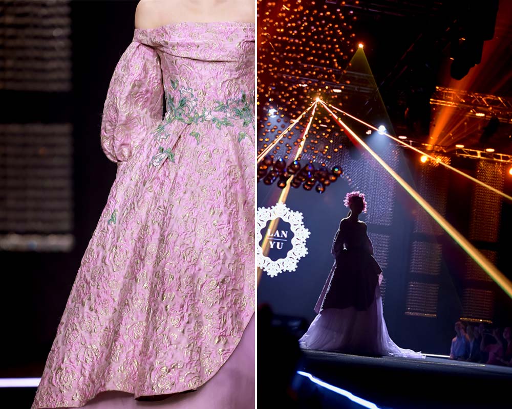 盛典秀場真實(shí)還原了巴黎時(shí)裝周舞臺,讓觀眾擁有了極致的感官體驗(yàn)。40余套不同風(fēng)格的禮服傾情展出設(shè)計(jì)中如同水墨畫恣意揮灑的筆墨,將山河間幽深、清遠(yuǎn)、縹緲的東方韻味表現(xiàn)得淋漓盡致。
