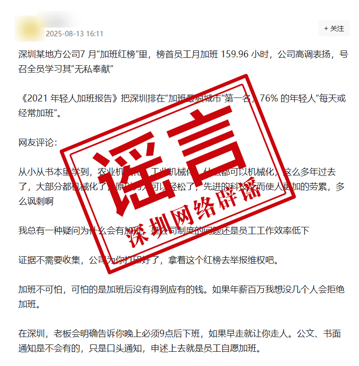 近日,一則《關(guān)于加班的通報表揚(yáng)》在社交平臺引發(fā)熱議。部分網(wǎng)帖將涉事企業(yè)與深圳強(qiáng)行關(guān)聯(lián),冠以“深圳某公司”名義進(jìn)行傳播,并稱深圳存在普遍的加班現(xiàn)象。經(jīng)核實,涉事企業(yè)非深圳企業(yè)。