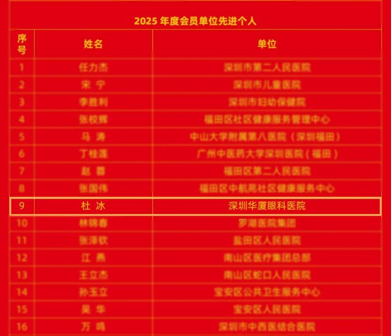 深圳新聞網2026年1月29日訊(記者 林恒鑫)1月27日,深圳市社區(qū)衛(wèi)生協(xié)會公布了2025年度優(yōu)秀分支機構及先進個人名單,深圳華廈眼科醫(yī)院副院長杜冰教授因在社康眼健康服務中的突出表現,榮獲“2025年度會員單位先進個人”稱號。