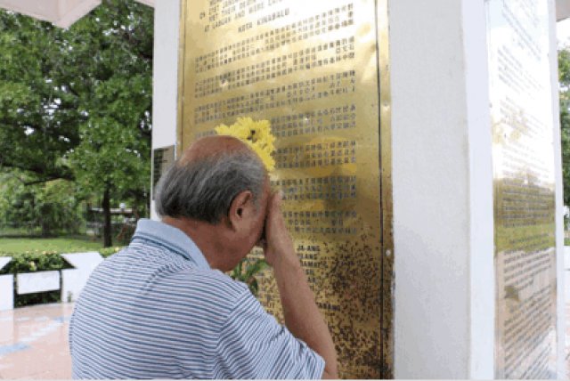2018年6月22日,我攜兒子宇懷及侄子道存、洪濤一行四人踏上萬(wàn)里尋親之旅,遠(yuǎn)涉重洋,飛抵沙巴。抵后連日驅(qū)車(chē)走訪烈士后裔、尋找知情華僑老人、憑吊當(dāng)年舊戰(zhàn)場(chǎng)Inanam大橋、瞻仰游擊隊(duì)大本營(yíng)Menggatal文茜坑、參訪中國(guó)駐哥打基納巴盧總領(lǐng)事館,拜見(jiàn)梁才徳總領(lǐng)事、劉雅楠領(lǐng)事。6月24日上午,在《北婆羅洲抗日神山游擊隊(duì)》紀(jì)實(shí)文學(xué)作者陳冬和先生和83歲高齡的抗日烈士后裔石硯田老先生的陪同下,一行來(lái)到肅穆的神山游擊隊(duì)紀(jì)念公園。公園正面牌樓的“神山游擊隊(duì)紀(jì)念公園”名,白底黑字,分別用中、英、馬來(lái)文書(shū)寫(xiě),顯得格外莊重醒目,門(mén)樓上飄揚(yáng)著馬來(lái)西亞國(guó)旗,烈士紀(jì)念碑巍然矗立于公園中央,碑前廣場(chǎng)瓷磚鋪就,廣場(chǎng)中間有一片用砌磚圍著的長(zhǎng)方形草坪,據(jù)說(shuō)是當(dāng)年烈士遇害的大土坑,戰(zhàn)后被填平,上面綠草如茵,地下掩埋著哥哥張桂有等176位神山游擊隊(duì)英烈遺骸。紀(jì)念碑的四周銅牌鑲嵌,正面鐫刻著176位烈士的英名,其余三面是中、英、馬來(lái)三種文字銘刻的碑記。當(dāng)我在烈士紀(jì)念碑上找到哥哥張桂有的名字,不禁百感交集,久久伏碑,撫摸著張桂有三個(gè)漢字,壓抑已久的眼淚再也控制不住,奪眶而出,抱碑嗚咽!75年了,終于找到了多年思念尋覓的親人!哥哥當(dāng)年與鬼子英勇拼殺的激烈場(chǎng)面、慷慨就義的壯烈情景一幕幕浮現(xiàn)在面前。我們?cè)诩o(jì)念碑前獻(xiàn)上鮮花,深深鞠躬默哀,深切悼念我的家兄張桂有和他的戰(zhàn)友們。我想此時(shí)此刻,哥哥和戰(zhàn)友們的英靈一定在冥冥里接受我們的祭奠。