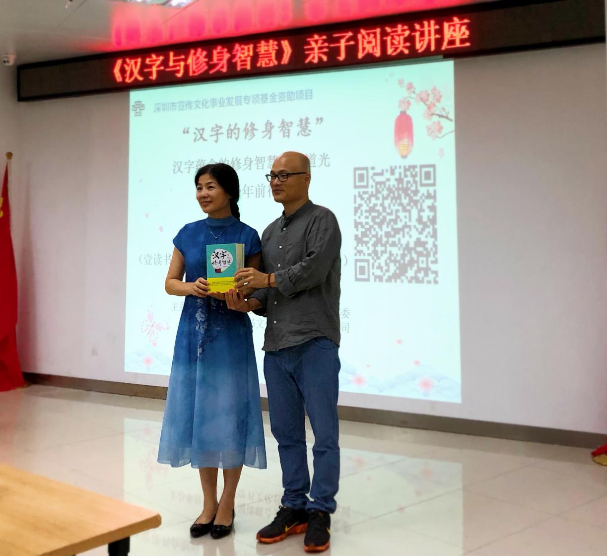 講座在親子之間、講者與聽眾之間充滿趣味性的互動中接近尾聲,劉建彪先生向龍湖社區(qū)黨群服務(wù)中心圖書館贈送《漢字與修身智慧》書籍,希望更多的青少年用心感受中華優(yōu)秀傳統(tǒng)文化之美。