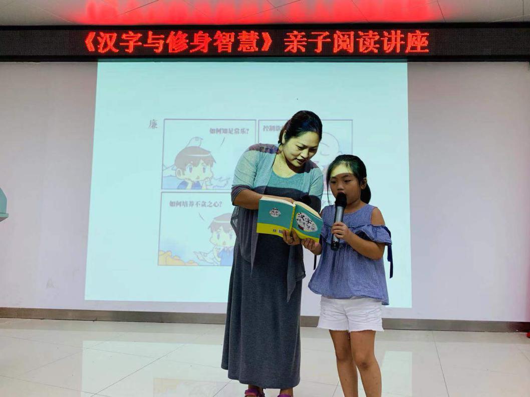 壹讀書會創(chuàng)始人、知名閱讀推廣人、《漢字與修身智慧》作者劉建彪先生作為講座的主講人,準備了“修身三十六字口訣”和漢字的漫畫,以“互動為主,講授為輔”的方式,讓現(xiàn)場親子共讀一本書,共同感受漢字的力量。