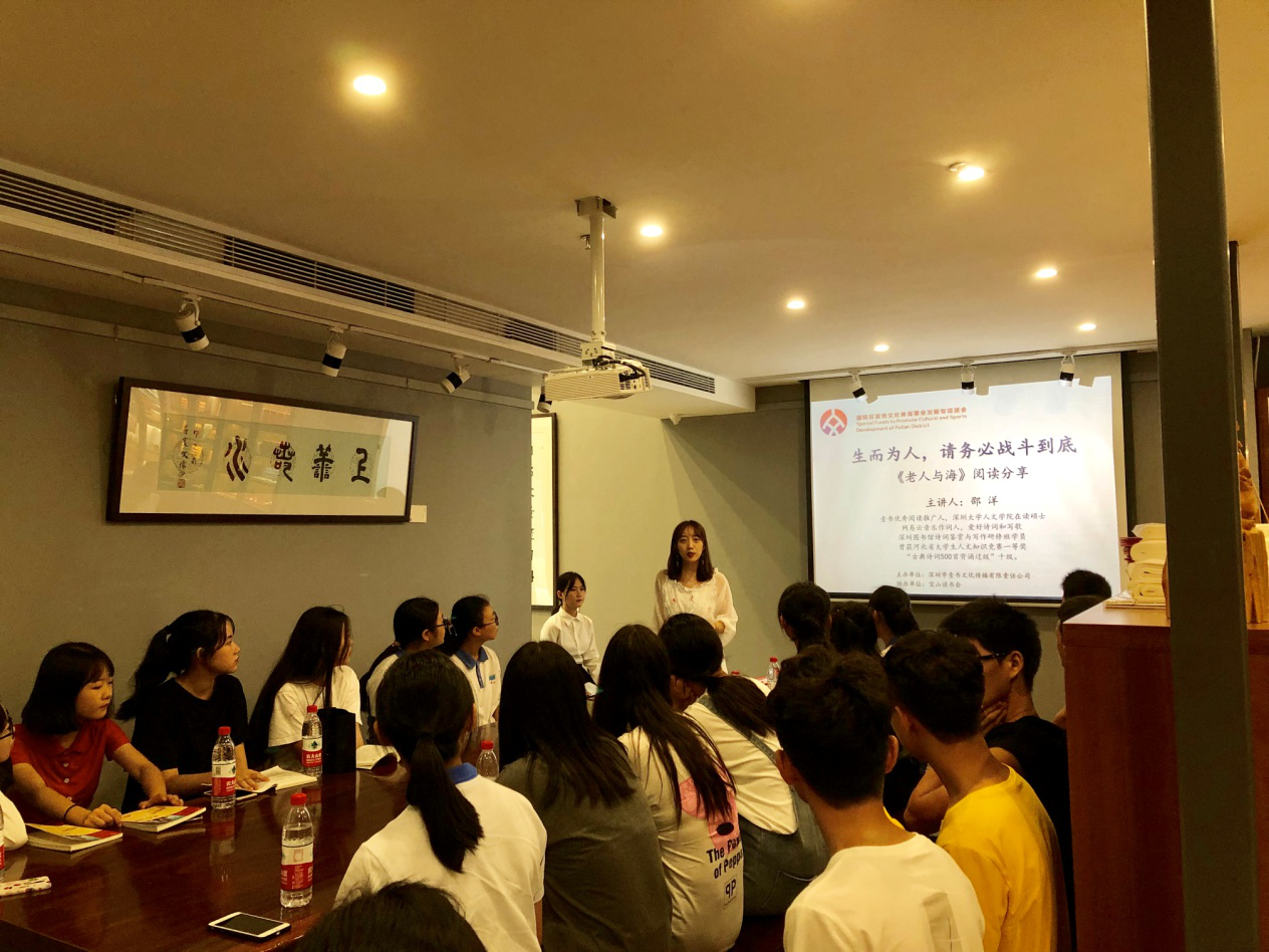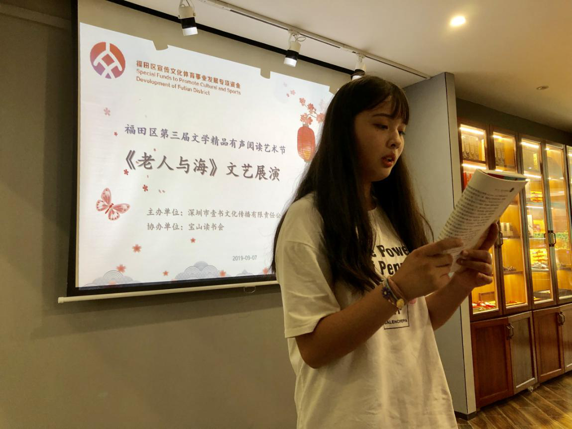 深圳新聞網(wǎng)訊 2019年9月7日,由深圳市壹書文化傳播有限責(zé)任公司主辦、寶山讀書會(huì)協(xié)辦的“福田區(qū)第三屆文學(xué)精品有聲閱讀藝術(shù)節(jié)”之《老人與?!烽喿x分享會(huì)暨文學(xué)作品朗誦會(huì)在簡閱書吧香蜜湖店成功舉辦。來自深圳市寶山技工學(xué)校的學(xué)子們?cè)谥髦v人的啟示下分享閱讀感悟、誦讀精彩文摘,在文藝展演中體會(huì)圣地亞哥抗擊命運(yùn)的人生哲學(xué)。
