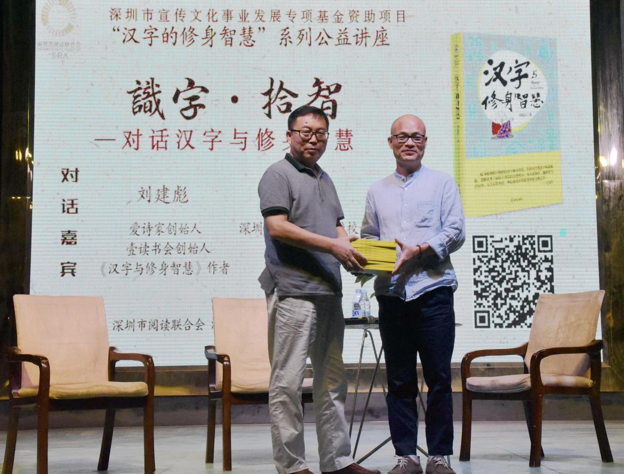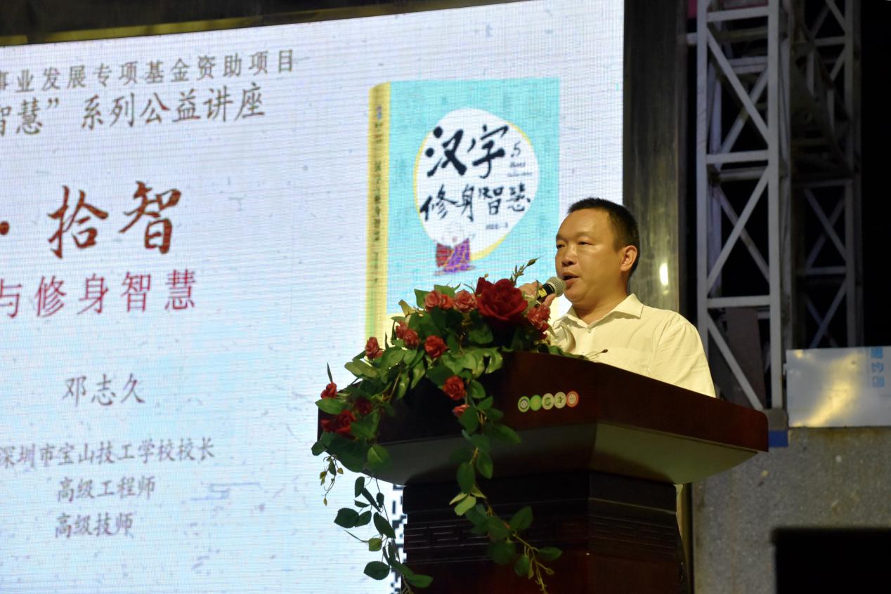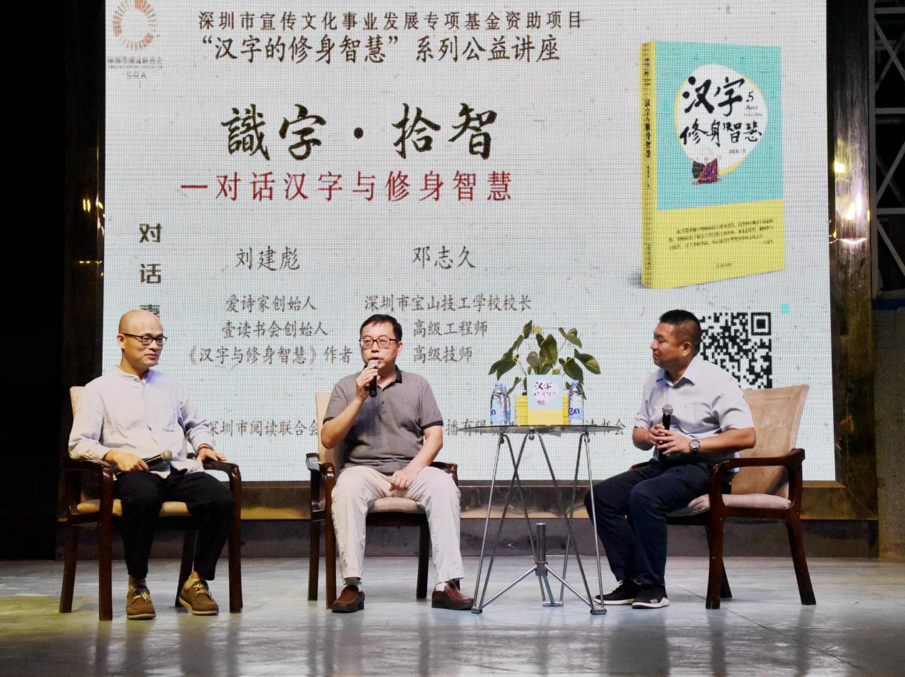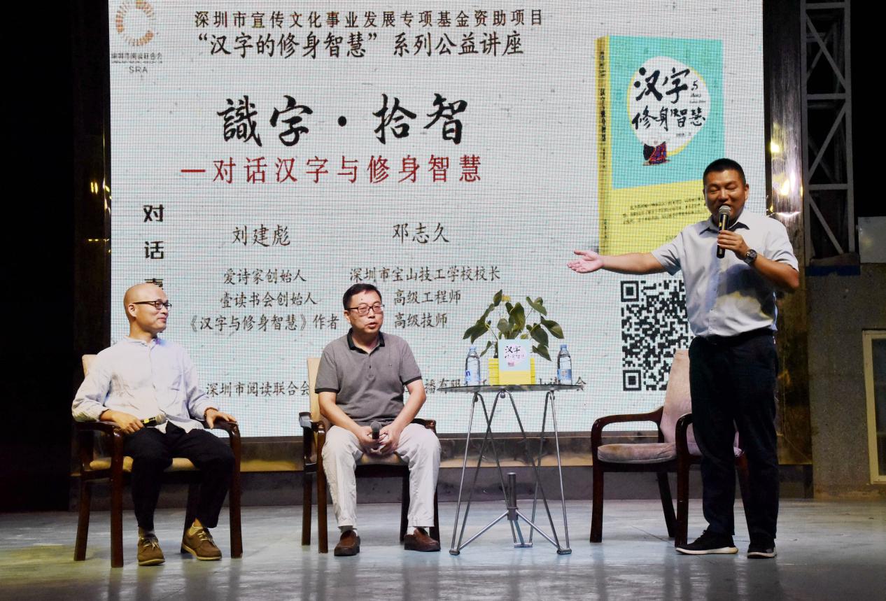 深圳新聞網(wǎng)訊 9月18日晚上7時,由深圳市閱讀聯(lián)合會、深圳市壹書文化傳播有限責任公司和寶山讀書會共同主辦的“‘識字拾智’——對話漢字與修身智慧”公益文化講座在寶山技工學校寶山大舞臺拉開了序幕。據(jù)悉,這是由深圳市宣傳文化事業(yè)發(fā)展專項基金資助項目“漢字的修身智慧”的第三場公益文化講座,以劉建彪《漢字與修身智慧》新書分享為契機,傳播漢字正能量,讓更多的青少年識字長智,領(lǐng)略漢字文化之精妙。