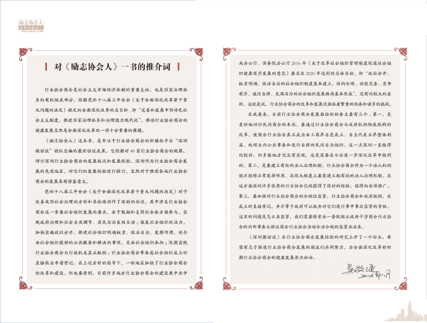 浙江大學(xué)公共管理學(xué)院院長郁建興教授肯定深圳微訪談編著的《勵(lì)志協(xié)會(huì)人》,從探索行業(yè)協(xié)會(huì)商會(huì)的實(shí)踐角度切入,對(duì)行業(yè)協(xié)會(huì)商會(huì)及運(yùn)營人的實(shí)踐經(jīng)驗(yàn)和品牌進(jìn)行總結(jié)分析和傳播,這對(duì)于行業(yè)協(xié)會(huì)商會(huì)實(shí)現(xiàn)提升治理能力的目標(biāo),具有重要意義。