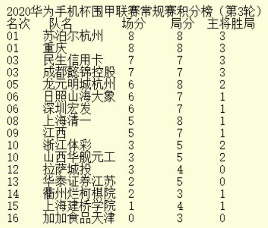 2020華為手機杯中國圍棋甲級聯(lián)賽第三輪深圳宏發(fā)3:1浙江體彩。具體戰(zhàn)況如下: