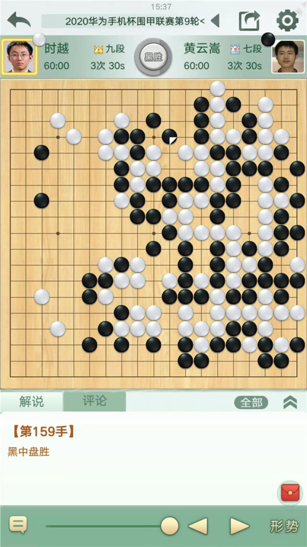 快棋臺(tái)由深圳宏發(fā)隊(duì)的時(shí)越九段執(zhí)白對(duì)陣江蘇隊(duì)的黃云嵩七段。開(kāi)局一個(gè)局部黑棋應(yīng)對(duì)欠妥,白方取得大優(yōu),然而時(shí)越之后的下法不夠簡(jiǎn)明,被黑棋抓住了機(jī)會(huì),局面變得混亂。在之后雙方大龍的接觸戰(zhàn)中,白方再次放棄簡(jiǎn)明做活的下法,與黑棋大龍形成雙活,但結(jié)局是外圍厚薄損失慘重,白棋下成后手雙活之后無(wú)暇顧及下方大龍安危,被黑棋一舉擊潰。