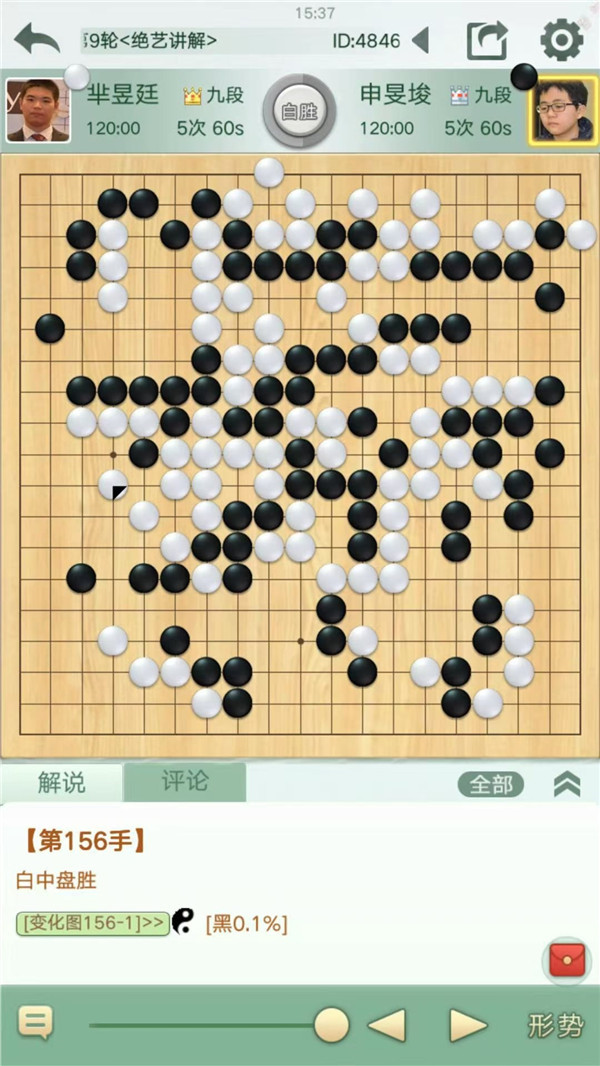 慢棋第四臺(tái)由深圳宏發(fā)隊(duì)的沈沛然六段執(zhí)黑對(duì)陣江蘇隊(duì)的趙晨宇八段。白方開(kāi)局步調(diào)良好,局面小優(yōu)。中盤(pán)時(shí)黑方企圖沖擊白棋薄味,但未能找到較為有效的手段。在形勢(shì)較為不利的情況下,沈沛然選擇了強(qiáng)行開(kāi)劫拼搏,但無(wú)奈劫材不夠,轉(zhuǎn)換之后繼續(xù)虧損,再難挽回局面,可以說(shuō)是白棋完勝的一局。