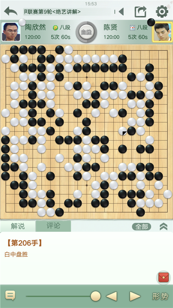 慢棋第一臺(tái)由深圳宏發(fā)隊(duì)的陶欣然八段執(zhí)白對(duì)陣江蘇隊(duì)的陳賢八段。雙方開(kāi)局下出一個(gè)復(fù)雜的大型變化,局面一度兩分。序盤(pán)結(jié)束時(shí)陶欣然下出一步緩手,使得勝負(fù)的天秤向黑方傾斜。弈至官子階段,黑方下出了大意的敗招,單官?zèng)_斷白兩塊活棋,相當(dāng)于自停一手,使得白棋追回不少目數(shù)。之后黑棋如繼續(xù)收官局面仍然細(xì)微,但陳賢在出現(xiàn)失誤后心態(tài)失衡,孤注一擲殺白大龍,最終失敗,白棋幸運(yùn)獲勝。
