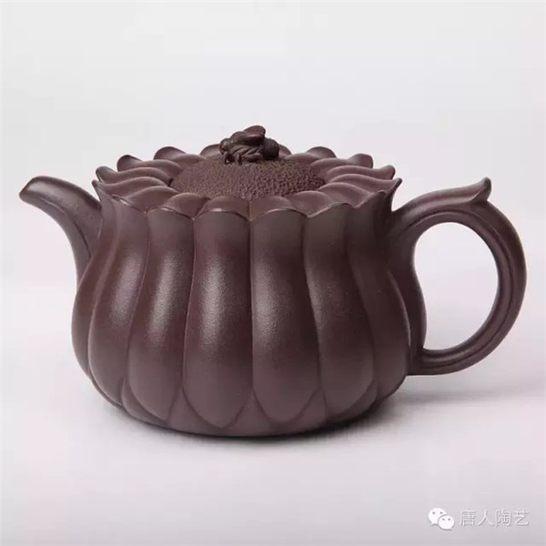 第一件,《蜂菊壺》取材于大自然蜜蜂采蜜之情形,立意新穎。壺身等分成十六瓣,俯視如盛開的菊花,蓋為花蕊,壺鈕設(shè)計(jì)成正在花蕊上采蜜的蜜蜂。顯得靜中有動,生機(jī)盎然,側(cè)視該壺,筋囊飽滿凝重,通體線條流暢,大氣中不乏精巧。菊花與蜜蜂肖形逼真,洋溢著大自然的和諧情趣。據(jù)說,唐朝霞老師為制作此壺,多次徘徊在桃花林里、菊花叢中,觀察蜜蜂的神態(tài),巧妙地讓蜜蜂造型躍然“蜂菊壺”壺鈕上,靜中寓動,令人叫絕。