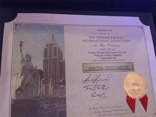 據(jù)悉,此次在美國舉行的巴拿馬太平洋萬國博覽會百年慶大會上,共有來自全球30多個國家5000個品種參展,盛況空前,共評出3個特等獎、10個金獎以及銀獎、銅獎、優(yōu)秀獎若干。唐朝霞的作品能夠獲得兩項(xiàng)大獎,無疑是宜興紫砂的杰出代表。百年之前的1915年,宜興紫砂在首屆巴拿馬太平洋萬國博覽會上也曾讓世界為之傾倒,程壽珍的“掇球壺”、范大生的“大柿子壺”獲頭等獎。1933年,在美國芝加哥萬國博覽會上,宜興紫砂再次轟動世界,范大生的“合棱壺”、俞國良的“四方傳爐壺”、汪寶根的“東坡壺”、朱可心的“竹節(jié)鼎”喜獲金獎。國人眾所周知,茅臺酒是榮獲巴拿馬萬國博覽會金獎一舉成名的,而今,宜興唐朝霞的《蜂菊》壺獲得本次活動的特別金獎、《丹鳳朝陽》壺獲得金獎,喻示著:唐朝霞的作品不僅走出了宜興、走到深圳,還走出了國門、走向了全世界!